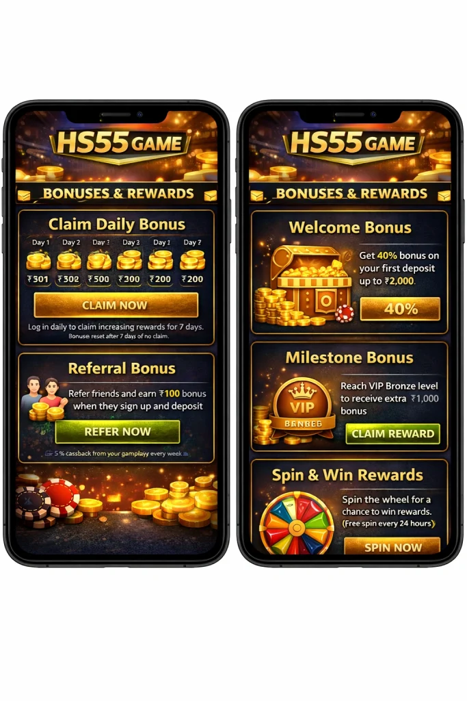 HS55 is a mobile-based gaming application that offers multiple online games in one platform along with user account and reward features.