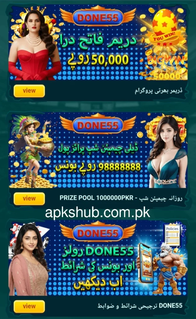 Done55 top Earning App is a simple, smooth, and user-friendly platform. It is designed for people who want easy online gaming.The platform focuses on safety, comfort, and enjoyment. This makes it suitable for all users in Pakistan.Overall, it provides value, entertainment, and a positive gaming experience.